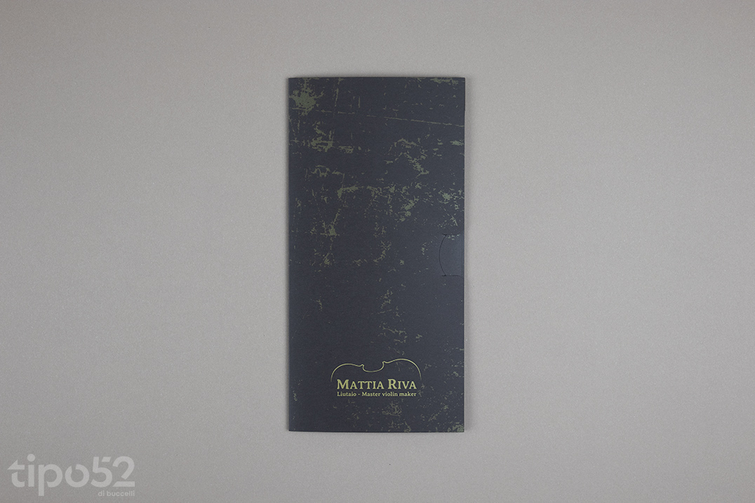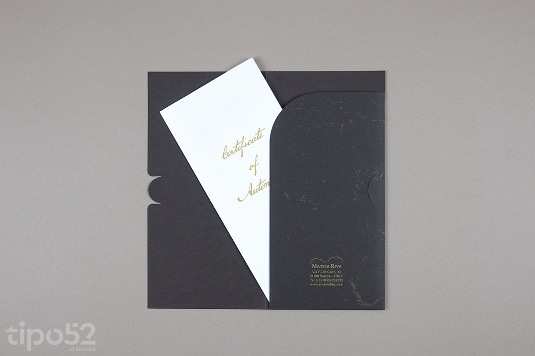 Descrizione: Mattia Riva è un maestro liutaio, ovvero ripara e costruisce violini nel suo laboratorio di Varese. Per lui abbiamo progettato e realizzato cartelline per contenere i certificati di autenticità dei suoi violini. Abbiamo studiato un layout con lembi su misura per il folder, dotato sul fronte di asola ad incastro per una chiusura sempre perfetta. Abbiamo utilizzato una carta color tabacco e stampa color oro ricreando sulla superficie un effetto che richiama una superficie usurata come potrebbe essere quella del legno di un vecchio violino.