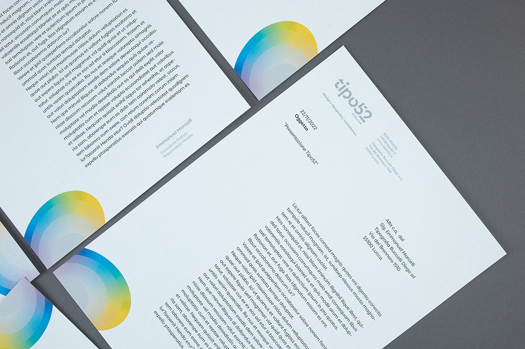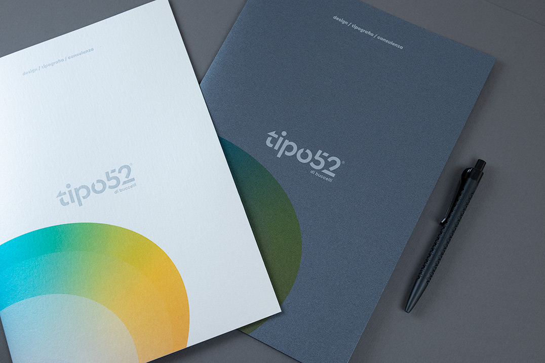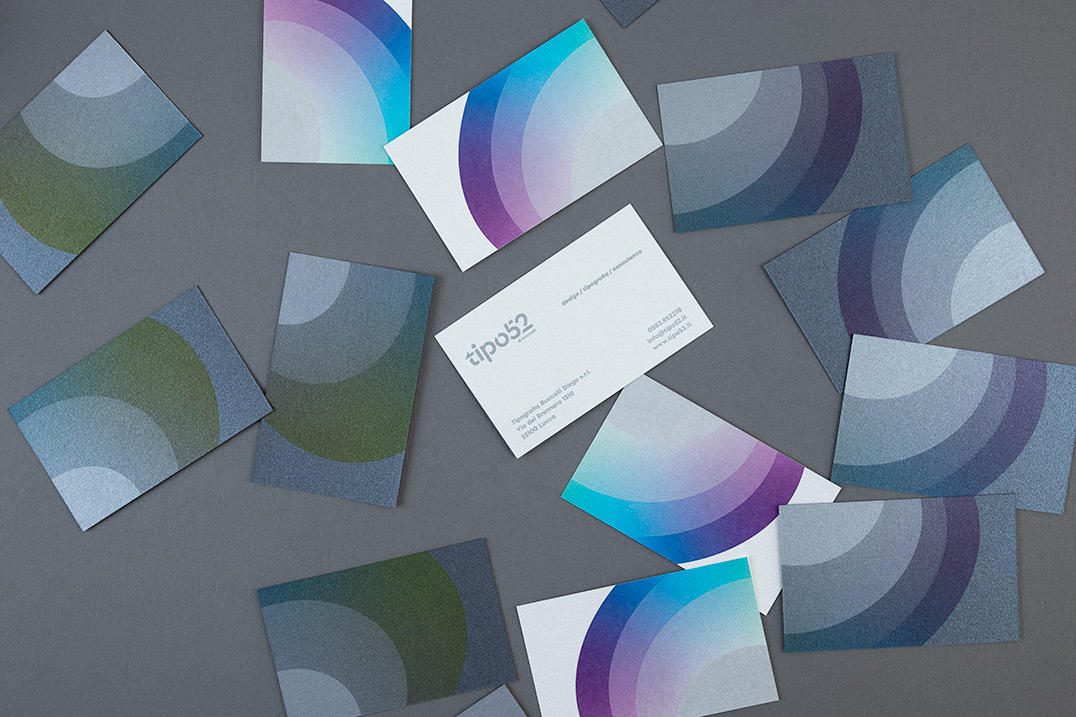Abbiamo realizzato per nostro uso interno un coordinato di cancelleria istituzionale a tema. Per esprimere al meglio il concetto Silver abbiamo utilizzato una carta con finitura perlescente Buccelli Orion, nelle 2 tonalità avorio e antracite; la carta intestata è invece stata realizzata su carta vergata. Il marchio Tipo52 è stato stampato in argento mentre il motivo Silver in quadricromia + argento per ottenere un motivo dai riflessi innovativi, in particolar modo sul supporto antracite.